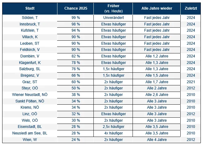 In der Regel waren weiße Weihnachtsfeste in fast allen Städten einst etwa doppelt so häufig, unter anderem in Graz, Steyr, Sankt Pölten, Krems, Wien, Wels und in der Wiener Neustadt.
