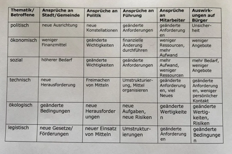 An dieser Tabelle kann unschwer abgeleitet werden, dass es mit veränderten Rahmenbedingungen – die zurzeit alle treffen – es geänderte Herangehensweisen an die einzelnen Thematiken gibt. , ja geben muss. Das bedeutet Change-Prozesse und Prozessänderungen, in den gemeindeeignen Schlüsselprozessen wie Meldewesen, Katastrophenschutz, Finanzen und Haushalt, Infrastruktur, Energieversorgung, Wasser und Abwasser, Bildung, Wirtschaft, etc.