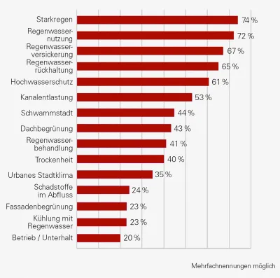 Die ungleiche Verteilung des Regenwassers zwischen punktuellem Starkregen und Trockenperioden spiegelt sich in den Topthemen der Zukunft wider: Starkregen und Regenwassernutzung stehen mit 74 und 72 Prozent bei den Befragten ganz oben.